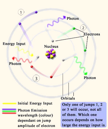 This theory is much newer and extensive research, mostly in Germany, is being carried out to prove it. This theory pulls upon a similar physics principle to the one above, but slightly different. It also has to do with the electrons in our bodies, however it is not about electron transfer between atoms, but within an atom. When a chemical reaction occurs it is a well known fact that there is a transfer of energy between reactants. Usually in these systems a dynamic equilibrium exists which allows for the control of such mechanisms by means of precise energy preservation within the system. What this means is that control mechanisms exist within our bodies to harness the energy released from one reactant (chemical) and make sure that as little as possible of this energy is lost to the surroundings, while transferring it to the appropriate target. For example our body uses glucose as a primary fuel (energy) source, however glucose isn't simply combusted into energy because there would be a large amount of energy wastage involved. Instead our body organises glucose breakdown into 2 major cycles with a total of about 18 steps through which the energy from the initial glucose molecule is removed. During processes such as oxidative phosphorylation (glucose breakdown) the energy which is being carried around can excite the electrons orbiting around certain atoms by giving them this energy to carry. As they carry the energy the electrons can begin to spin faster around the nucleus. As they do so, they will begin to occupy a slightly different orbital - the path along which the electrons travel. The atom itself is very interesting in structure, in this diagram the nucleus is not depicted to scale because it wouldn't be visible if it was. If the nucleus was the size of a football, then the electron cloud would be the size of a football field. Thus there is ample space present for the electrons to "wobble" around in. When the atoms reach their destination, they will offload the energy they are carrying, as this is done the excited electron from before will lose its extra energy and will begin to spin slower, thereby re-occupying its old orbital. However as it goes through this process of returning back down to its initial state it will release a tiny amount of radiation. The wavelength and frequency of this radiation will depend on which orbital it was on to begin with and which orbital it occupied when it was excited. This radiation is usually light. These emissions are very low energy, meaning that the light emitted is very weak. Click here to view an animated version of the picture above, it requires flash player. If you do not have it click here to download it.