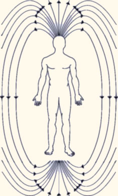 This is the older of the two theories and it believes that there is a minute magnetic field around the human body. Thus the body can be considered a large, yet ironically very weak magnet. The north pole is at the head and the south pole at the feet. This theory is believed to be true because of a simple physical law - a wire carrying a current of electricity induces a magnetic field around itself. The human body of course doesn't have wires running through it, but it does have nerves which are active all the time in one way or another. Nerves quite literally pass an electronic impulse along their fibers to the target cells. This postulated magnetic field is probably far more complex than what appears in this diagram which serves only as a rough guide.